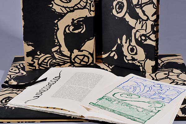 Illustrations de Pierre Alechinsky. Cinq eaux-fortes en couleurs signées et cinq eaux-fortes en brun, tirées par l’atelier Moret. Vingt-sept lithographies marginales tirées par l’atelier Clot, Bramsen et Georges. Emboîtage recouvert d’une lithographie.